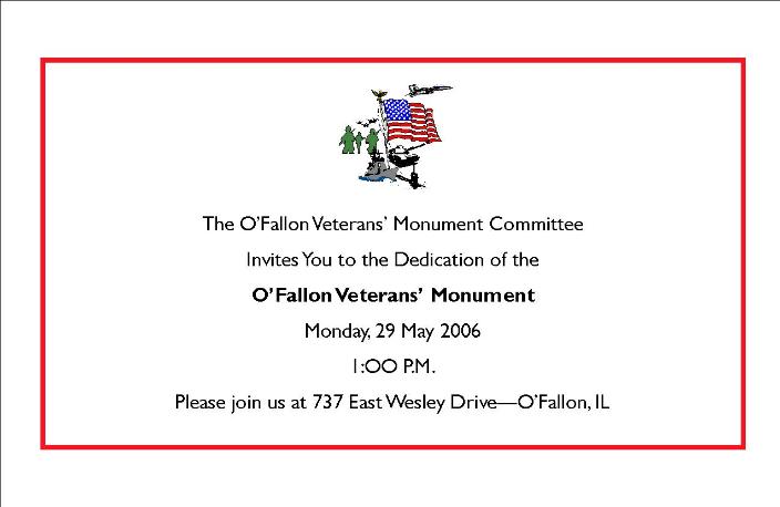 | Music begins at 12:30 pm. The program starts at 1:00 pm. The street in front of the monument will be blocked off for the dedication, so close parking may not be available. We urge you to allow extra time for parking and walking to the site. for BBQ hamburgers and hotdogs at 221 W First Street in Following the dedication, VFW Post 805 is inviting everyone O'Fallon. |